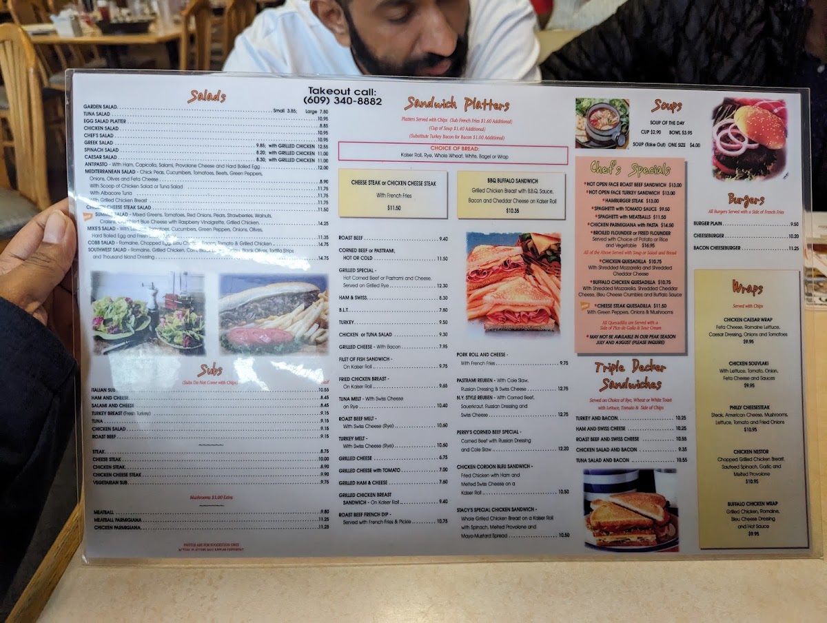 The all-day menu extends beyond breakfast to include poultry dishes and sandwiches. Poultry selections feature items like broiled chicken breast platters served with mashed potatoes and vegetables, chicken fingers with French fries, and Mike’s famous chicken souvlaki served with Greek salad, fries, and pita bread. The chef’s breakfast specials highlight meals like steak and eggs, hot jumbo biscuits with sausage gravy, and a house special featuring chipped beef over toast with eggs and home fries.